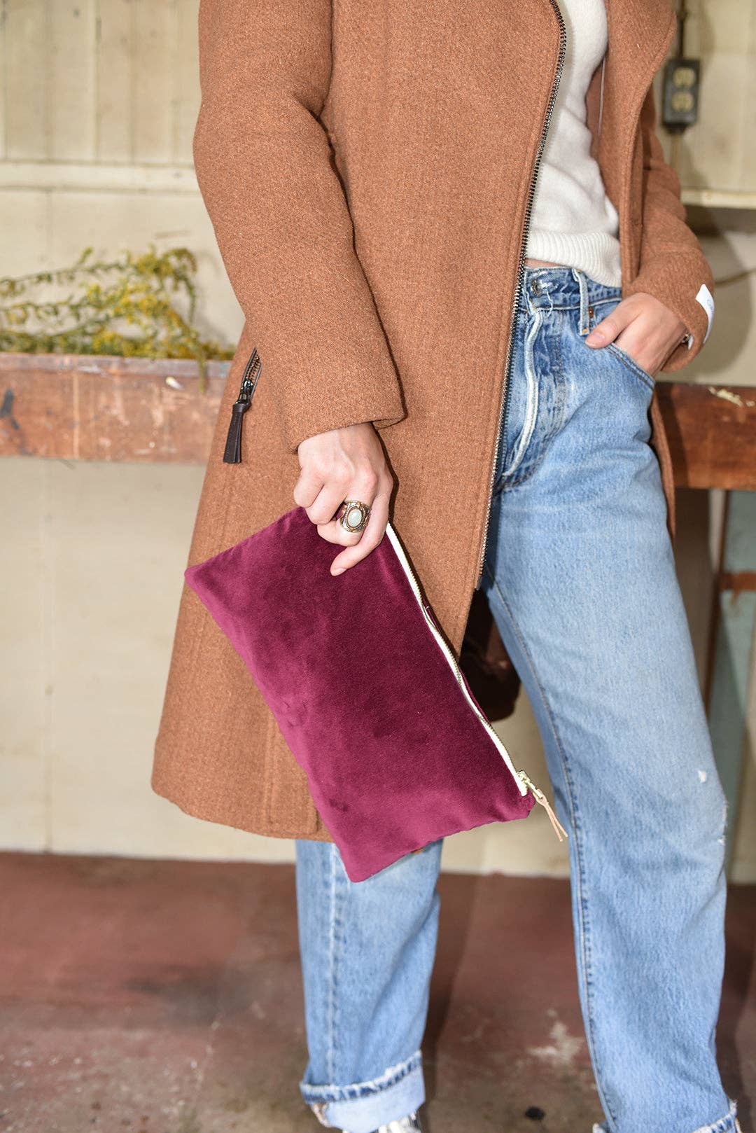 These luxe velvet clutches are lined with a fun hand printed navy polka dot design. Featuring a brass zipper with contrasting tape and brass zipper pull.